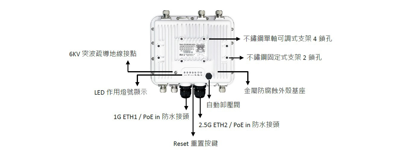 • 鋁合金機殼主基座材質設計,助於炎熱戶外酷暑環境下達到散熱最佳化,隨時保持最佳傳輸效能。