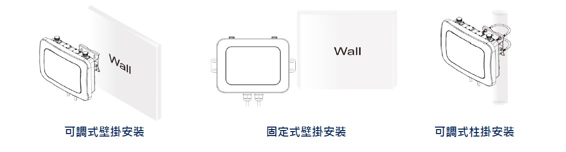 | 安裝方式 | 可調式壁掛安裝/固定式壁掛安裝可調式柱掛安裝 不鏽鋼U型卡 / 直徑 Ø34-Ø54mm 不鏽鋼O型束環 / 直徑 Ø30-Ø90mm |