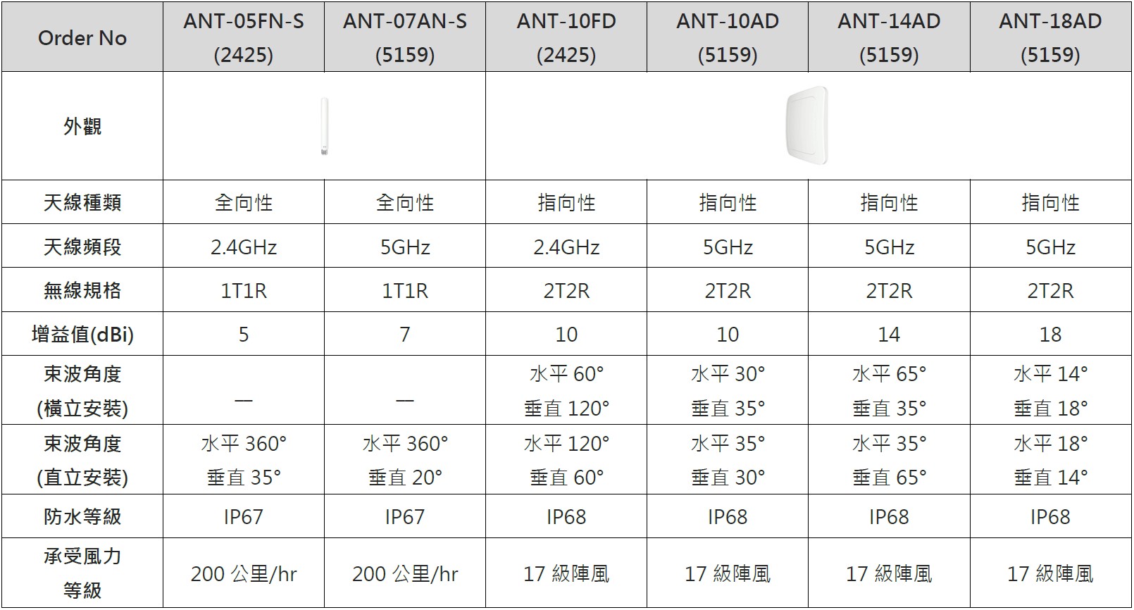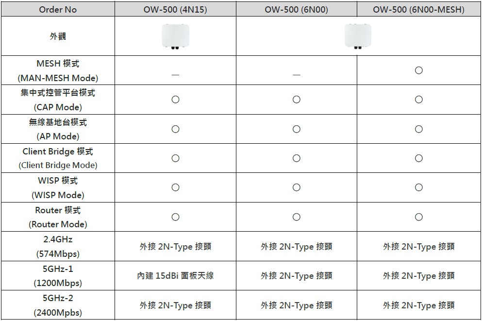 | 天線 | OW-500 (4N15): 2.4GHz : 支援2個N-Type外接天線防水接頭 5GHz-1 : 內建 15 dBi 5Ghz 2×2 雙極化指向性面板天線 5GHz-2 : 支援2個N-Type外接天線防水接頭 |